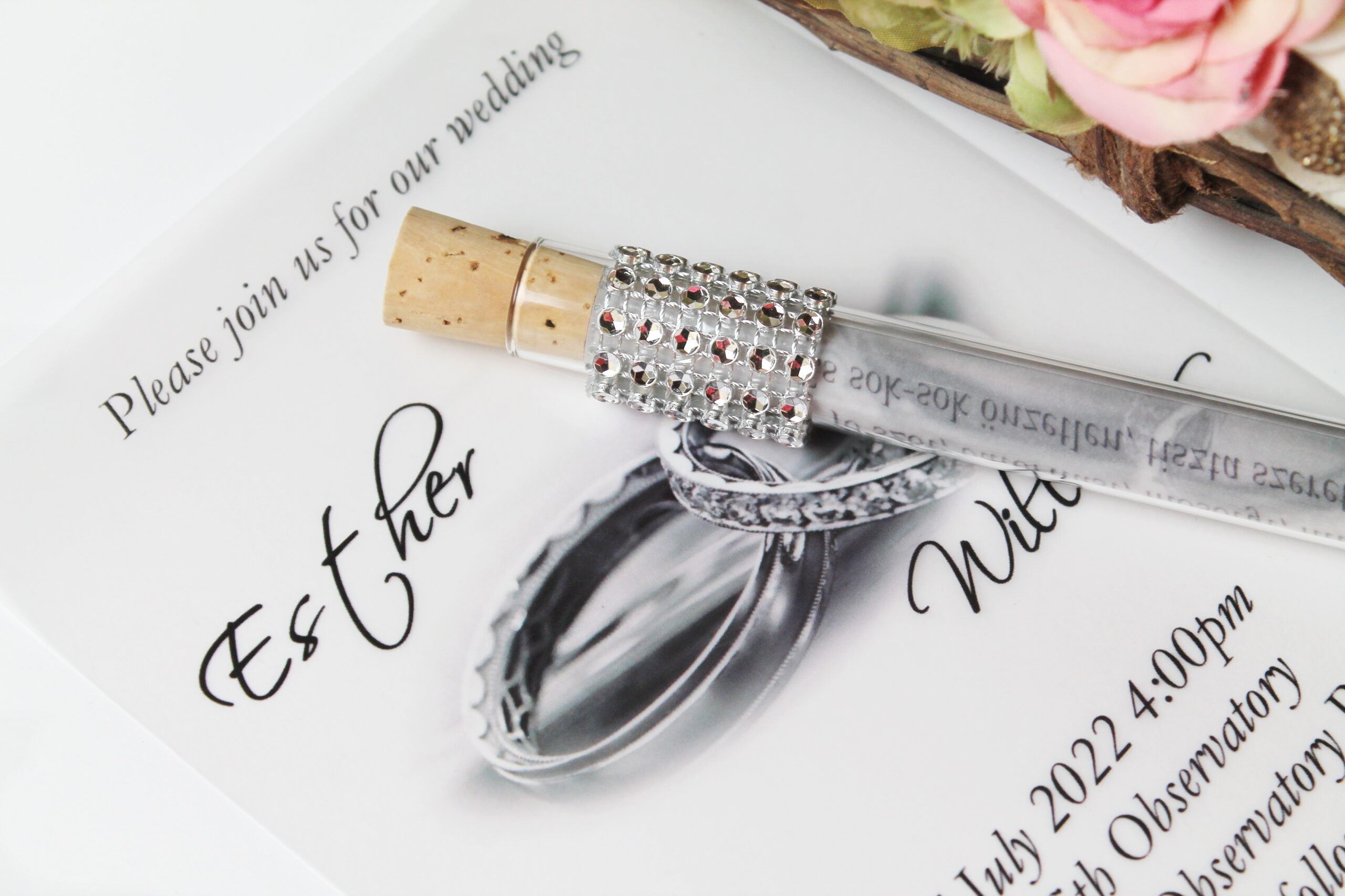 fehér vagy bézs színben. A kémcsöves meghívónál arany, ezüst vagy gyöngyház pauszpapír választható, többféle színű strasszal.